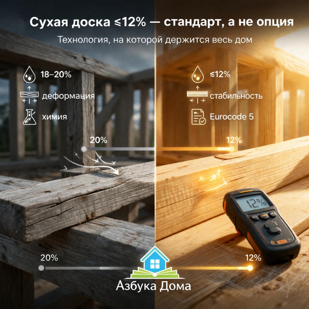 • Гарантию качества дома и возможность безбоязненно делать в нём ремонт. Когда древесина $\leq 12$ %, материал работает в расчётных условиях, заложенных инженерами, что исключает деформации из‑за усушки (коробление, трещины, перекосы).