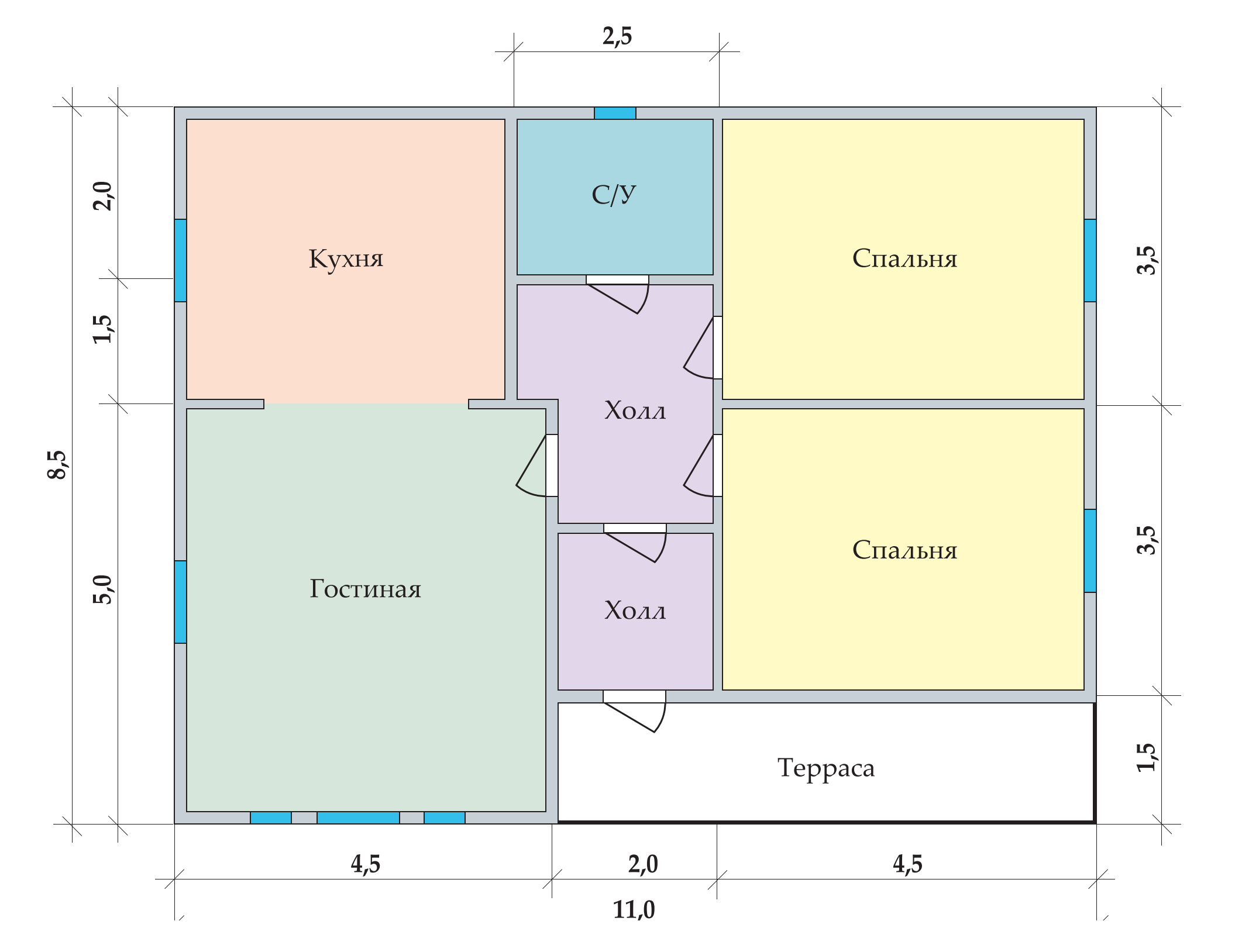 Коттедж «Заря 11х8,5» представляет собой просторный одноэтажный дом с четырьмя комнатами, в котором продумана каждая деталь – чтобы вы могли наслаждаться спокойной загородной жизнью.